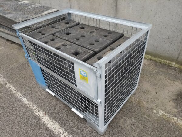 Speciale pallet voor het transport en opslag van 25 gestapelde kunststof bouwhekvoeten. Om dit pallet gemakkelijk te vullen, is aan één zijde een kantelhek voorzien. De andere drie zijden zijn gesloten zodat de voeten er niet uit kunnen vallen wanneer je de bouwhekvoetenpallet verplaatst.
